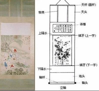 各个时代书画装潢有各自特色,可作为鉴别断代的辅助依据。如南宋宫廷收藏的书画有规定的装裱格式--绍兴御府装潢式,对不同等级的书画采用什么材料来装裱,都有严格的规定,如手卷用什么包首、什么绫子、什么轴心;立轴的用料的颜色、尺寸、轴头等都有一定的格式。元代宫廷藏画选择专人装裱。大德四年,"命裱工五芝以古玉象牙为轴,以鸾鹊木锦天碧绫为装裱,并精制漆匣藏