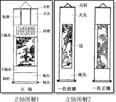 各个时代书画装潢有各自特色,可作为鉴别断代的辅助依据。如南宋宫廷收藏的书画有规定的装裱格式--绍兴御府装潢式,对不同等级的书画采用什么材料来装裱,都有严格的规定,如手卷用什么包首、什么绫子、什么轴心;立轴的用料的颜色、尺寸、轴头等都有一定的格式。元代宫廷藏画选择专人装裱。大德四年,"命裱工五芝以古玉象牙为轴,以鸾鹊木锦天碧绫为装裱,并精制漆匣藏于秘书库,计有画幅六百四十六件。"明代书画的装潢形式有进一步发展,书画卷增加了引首,并且有的被写上了字,有仿宣和装窄边的,也有用绫或绢挖厢宽边的;立轴则有宽边、窄边之分,有的还加了诗堂。清代宫廷收画的装裱,有其特殊的风格面貌。康熙、乾隆时期,装裱的用料和技术、形式各方面都比较好,卷、轴的天头绫多为淡青色,副隔水多为牙色绫,临近画心那一部分多为米色绫(或绢),立轴有的有诗堂,有的则没有,但一般都有两条绶带。立轴天杆上的圆曲是定制的,与非宫廷有显著不同。嘉庆以后,宫廷装裱的质量逐渐低落,立轴的天杆逐渐变粗(晚期成为方形)一部分轴头不再用紫檀、红木了,而且显得比较笨拙。手卷比康乾时期也显得粗些。