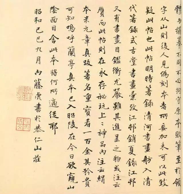 在传世的“领字从山”《兰亭》墨迹本中,台北故宫博物院收藏的“黄绢本《兰亭》”最为著名,是台湾大收藏家林柏寿(1895—1986)“兰千山馆”寄存之物,著录于《兰千山馆藏品特展目录》(台北故宫博物院1969年)。黄绢本《兰亭》纵24.3厘米,横70.2厘米。卷首有“褚河南临兰亭绢本真迹。米海岳跋”题签,拖尾有米芾长跋(其中有米芾题诗,故此卷又被称作“米芾诗题本”)、莫是龙二跋,王世贞二跋,周天球、文嘉、俞允文、陈仲醇、徐益孙、王穉登、沈咸、翁方纲、梁章钜、日本人内藤虎(湖南)等人题跋和题识。曾先后著录于孙鑛《书画跋跋》、卞永誉《式古堂书画汇考》、高士奇《江村消夏录》等书。清末为唐树义(1793—1854)所得,后流至日本。林柏寿从大阪著名收藏家齐藤悦藏(号董盦)手中购得。林氏因收藏黄绢本《兰亭》和怀素《小草千字文》,因名斋号曰“兰千山馆”。